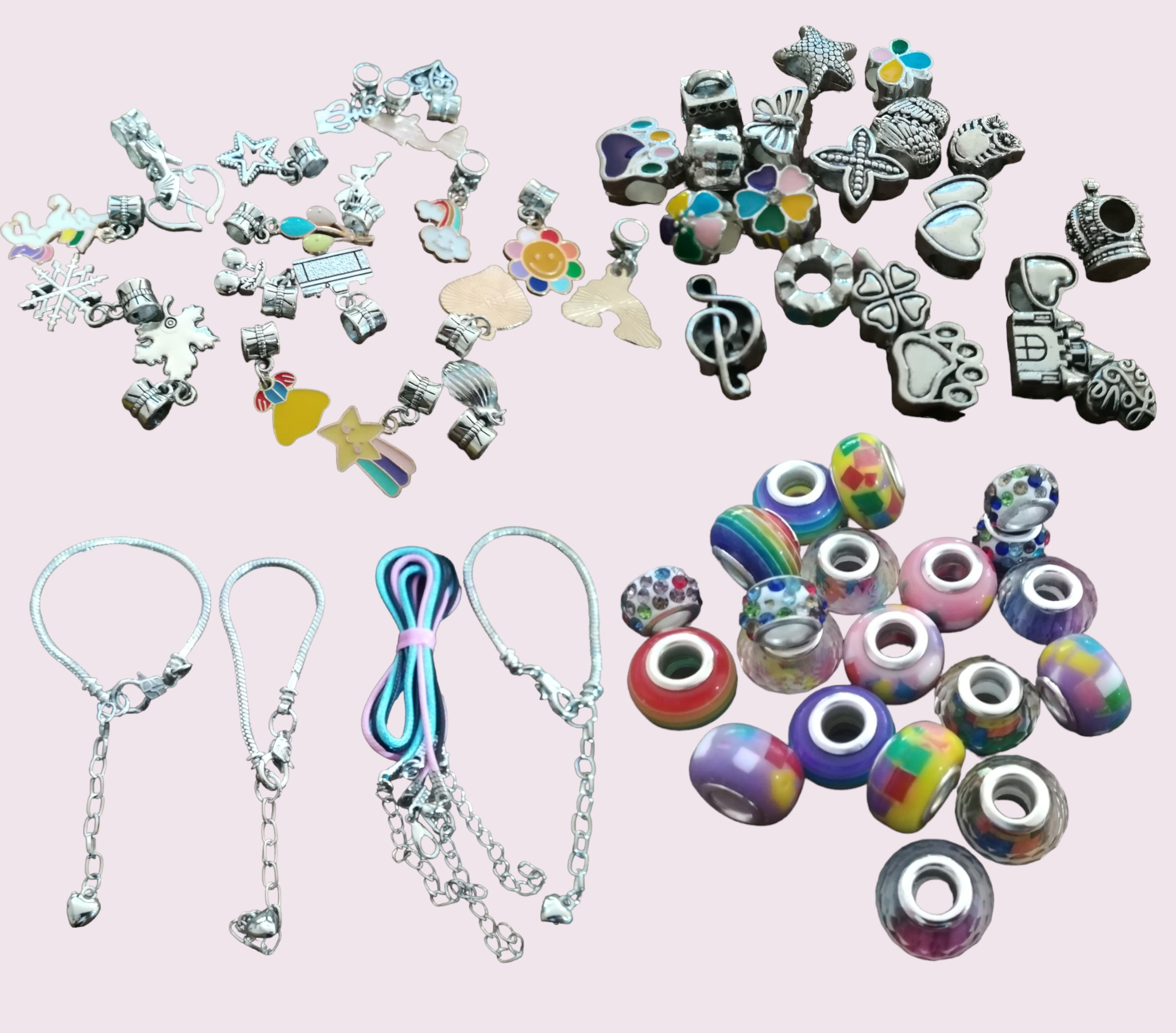 The set includes: 3 stainless adjustable bracelets, 3 colored bracelets, 20 round charms, 20 stainless shaped charms, 20 hanging charms, 1 bracelet storage box